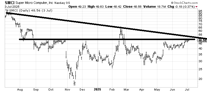 Super Micro Computer SMCI has gone nowhere for nearly a year, which immediately makes me suspicious when a tech stock has sat it out. A move over the resistance would be a big plus but the stop is far away under $40. If it can stay over $40 on a pullback it would be enticing.