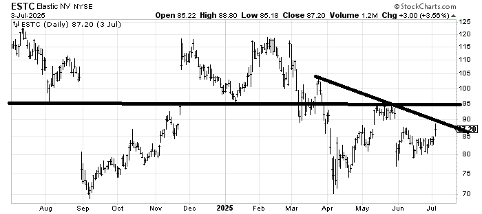 Elastic N.V. ESTC is a very odd chart with all those gaps — up and down. And all that resistance overhead. It fills one gap at $90, and if it gets through that $95 is another problem. If it gets over $90 I would imagine it then spends some time in the $90-95 area. Notice none of the gaps, again up or down, have follow through. The gaps up stop dead in their tracks as do the gaps down.