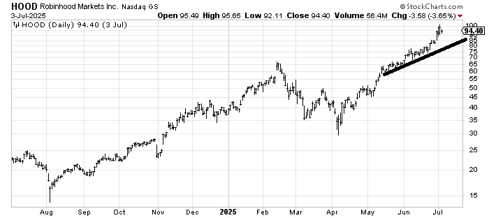 The only thing I see in the chart of Robinhood HOOD is that it met its measured target when it tagged 95. It also completed the 90/100 rule (90% of stocks that get to 90 will get to 100). And it is over-extended. If it can pull back to the line that would be helpful.
