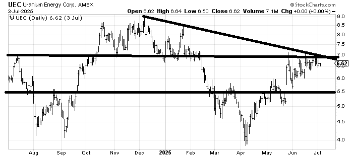 Uranium Energy UEC ran smack into resistance, so unless it can jump up over $7 I’d say it’s in a trading range between $5.50-7.