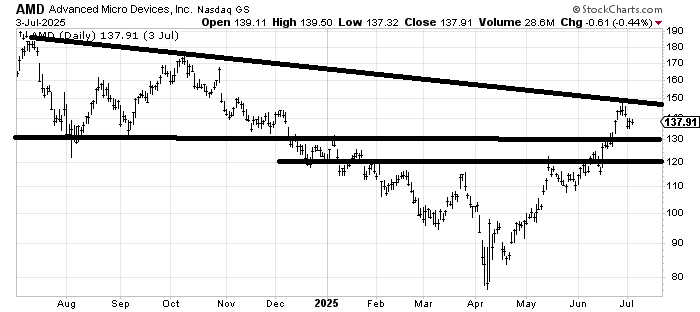 I believe it was late May when I recommended Advanced Micro Devices AMD but it has now run smack into resistance. It probably rallies again but I’d be in favor of taking a few profits and waiting for a better setup. There is some decent support around $130.
