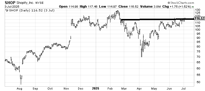 Shopify SHOP has been pretty stagnant since mid-May. If it can get up and over this resistance I’d consider it bullish. Under $105 and the stock is in trouble.