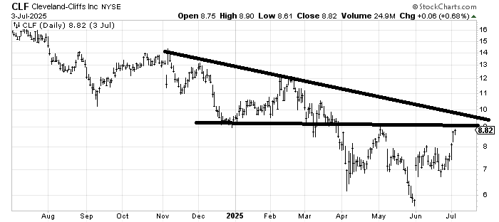 Cleveland-Cliffs CLF has a lot of resistance to contend with in the $9-10 area. I suspect the stock tries to eat through it but in the near term that’s resistance.