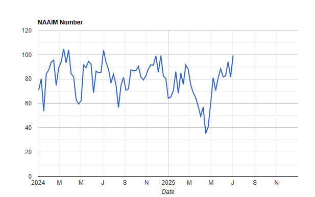 I said I was surprised the NAAIM folks who had been nearly ebullient the week prior had pulled in their horns as they went from the low 90s in exposure back to 80. But this past week changed that. They are now kissing the 100 mark. This would be the highest since a year ago. As a reminder, over 100 and they are on margin.