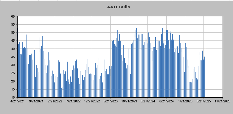 I was surprised the AAII folks had not gotten the least bit bullish, but to be fair they have been mostly cautious for nearly a year now, all while being over 60% invested. Yet this past week finally saw this cohort change as the bulls jumped ten points to 45%, the highest reading all year. It is not that this reading is extreme, but they clearly finally jumped the fence.