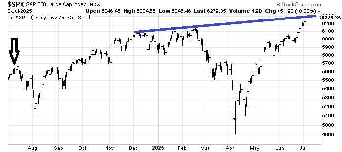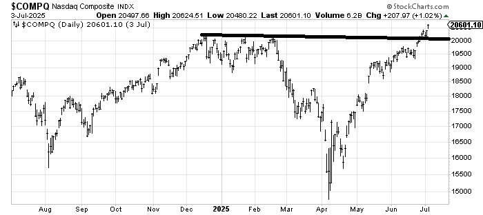The arrow on the chart of the S&P shows that period of time last summer when the DSI got extreme. I have also drawn in a very thick (some will argue too thick!) line that shows some resistance here, although the Nasdaq has cleared a similar line (the Nasdaq’s line is flatter, not upslanting).