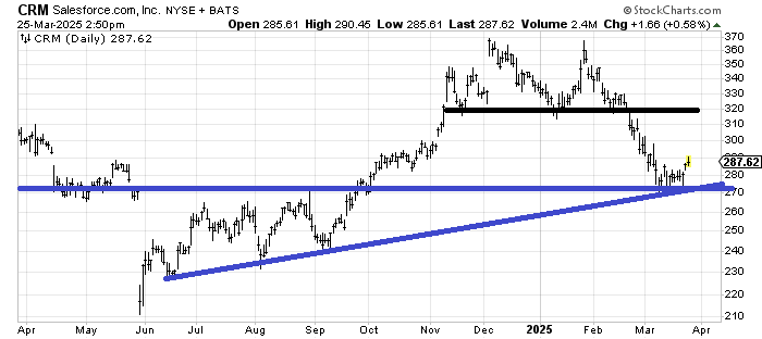 Salesforce CRM bounced off support lethargically, but it also broke down from a double top with a measured target around 270. My inclination for now is to see if it can spend some time building a base down here because that 320-resistance area is going to be tough without any base building. It appears it has a long road to work.