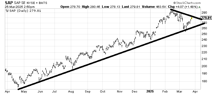 SAP SAP looks overbought to me up here. A pullback toward the line would get me interested again because then the risk/reward would be better (near 260).