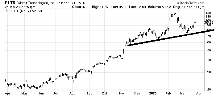 Palantir PLTR has light resistance at 100 and a small, measured target there as well, so I would guess in the very near term, it’s a trouble spot. For the most part, though, this looks like a correction, so unless/until it cracks under 70 in the next few weeks, it gets the benefit of the doubt.