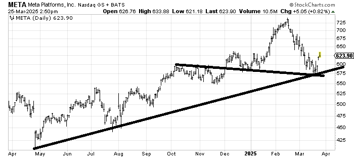 I will admit when I look at the chart of Meta META I see the potential for a head and shoulders top. I suspect, though, for now, if the stock pulls back to fill that gap around 600, it will bounce. Should it fail to get over 625 on such a bounce, I would fret over that head and shoulders top scenario. Right now, it just has decent support 550-600.