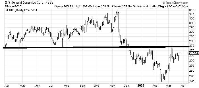 There is someone who asks about General Dynamics GD all the time so I feel compelled to note that there is a little (tiny compared to all the resistance overhead) head and shoulders bottom shaping up. I suspect it makes a stab at the neckline and that spike high near 280 in the near term. And then it goes into a sideways trading range.