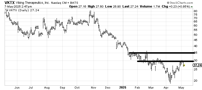 Viking Therapeutics VKTX is trying its best to eat through resistance (one bite at a time). A quick drop to 25 that holds that area would give it a bit more symmetry, and then I’d look to see if it can make a move over 30. So, a stop under 25, then it has to get over 30, but the tiny little bottom it is working on is very tiny.