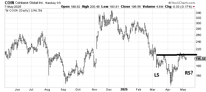 I was asked about Coinbase COIN a week or so ago, and I drew in a possible head and shoulders bottom. The stock has backed off. I would look for it to get oversold and bounce in the next few days.