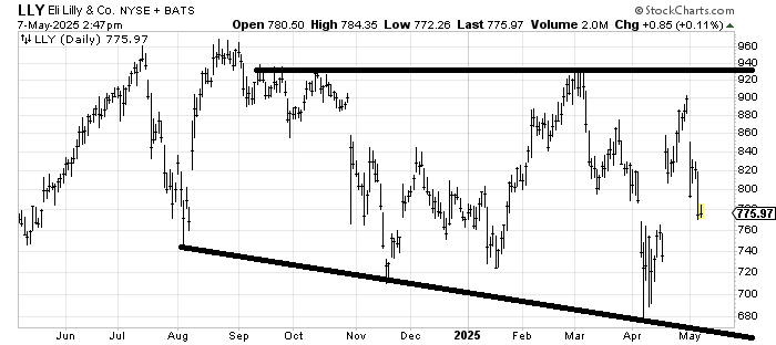 Eli Lilly LLY would be buyable for a trade on a gap fill around 760. Otherwise, it looks like it’s a stock in a giant trading range, only with lower lows and lower highs.