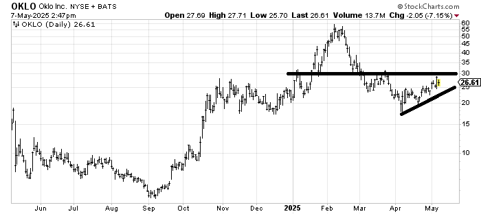 Oklo OKLOF looks to be working on the right shoulder of a head and shoulders bottom. Or is it working on the right shoulder of a much larger head and shoulders top? I’ll go with the former for now as long as it doesn’t break that short-term uptrend line.