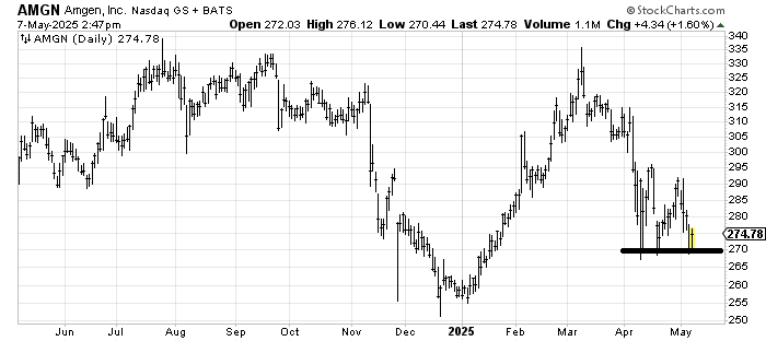 I was asked where Amgen AMGN might be buyable. The obvious answer is here with a stop under 270. We have typically had some good trades in Amgen, so I am on alert looking for a reason to buy it, but it feels a bit too soon to me. However, as long as it doesn’t break 270 with any gusto, this is the area.