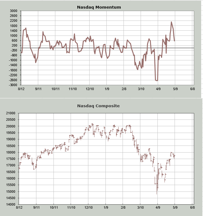 As we get closer to the intermediate-term overbought reading (mid to late May) I will focus more on the intermediate-term indicators. For example, the Nasdaq Hi-Lo Indicator continued downward today.