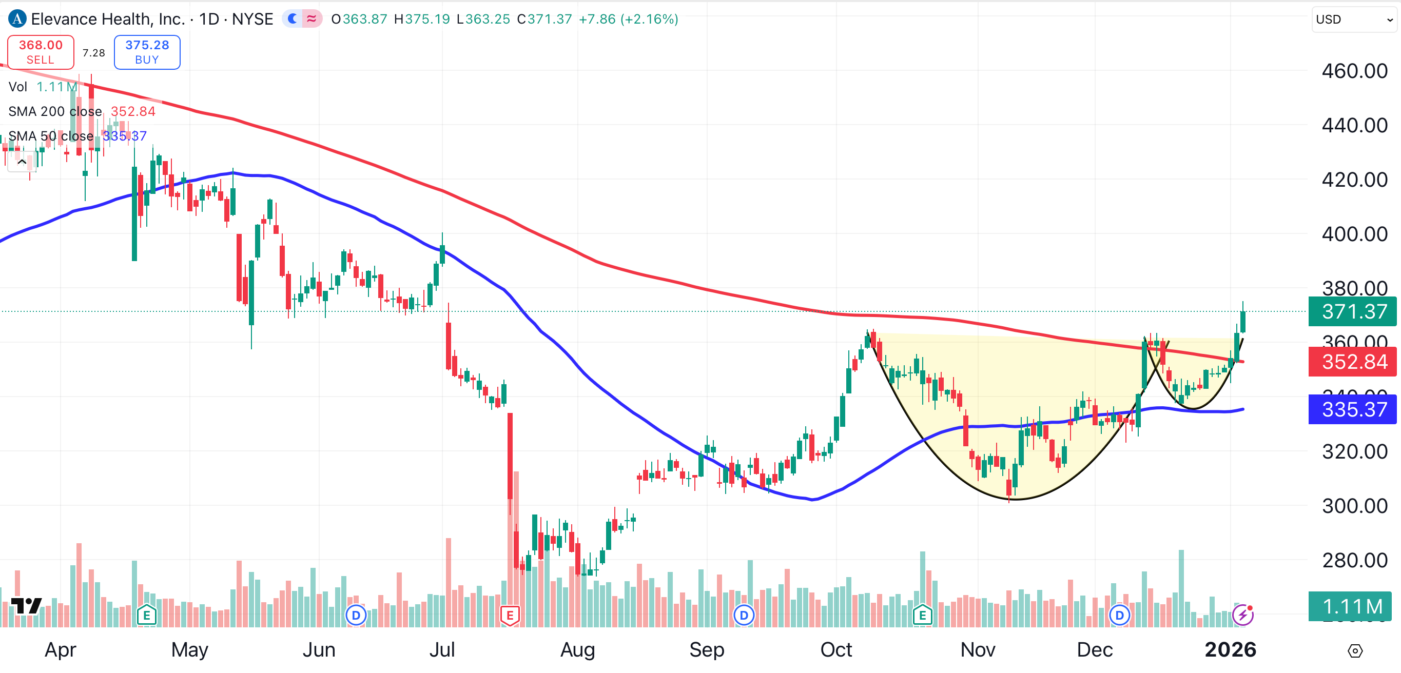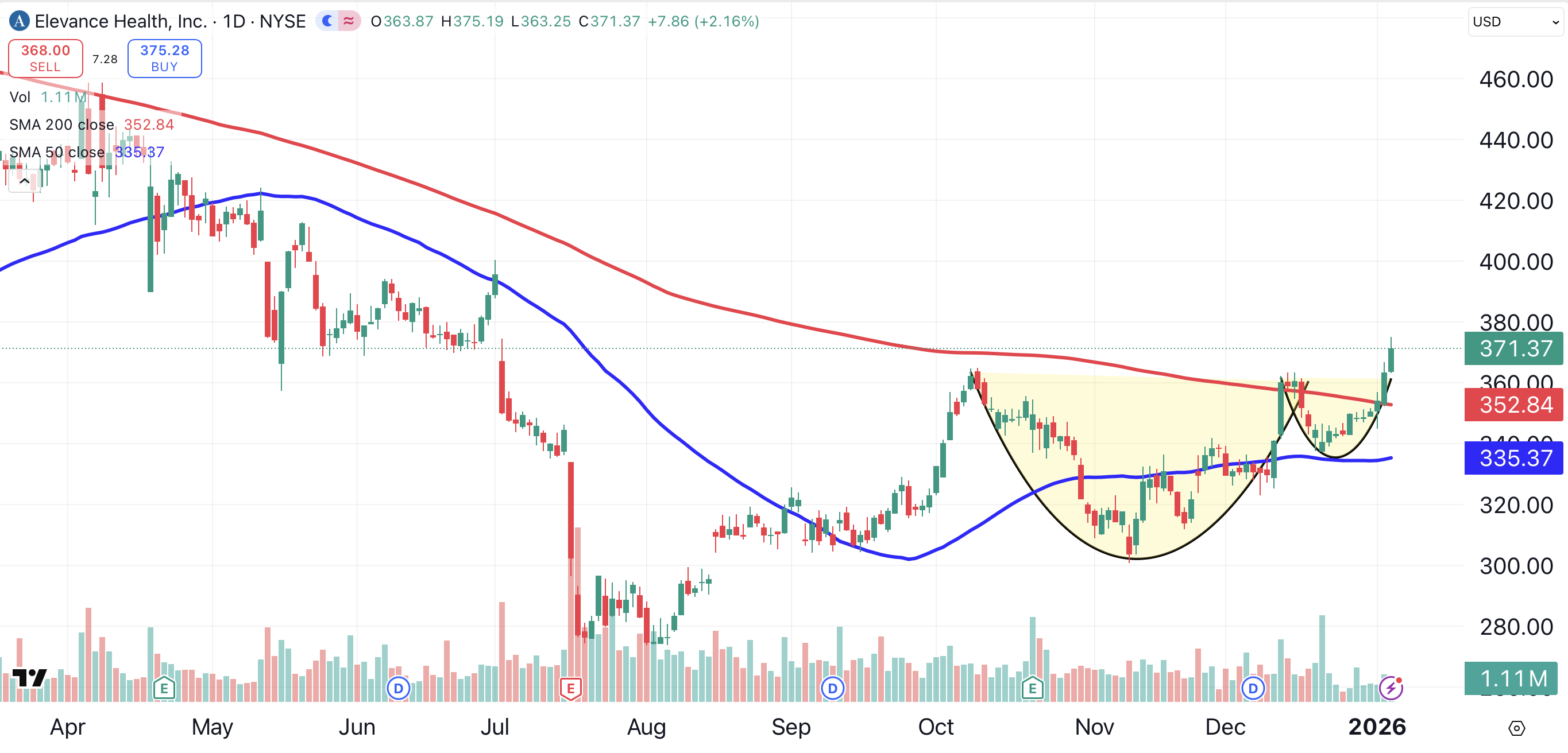On Tuesday, Elevance reached a six-month high, after closing higher for the fifth consecutive session. The stock recently broke above its 200-day moving average (red).