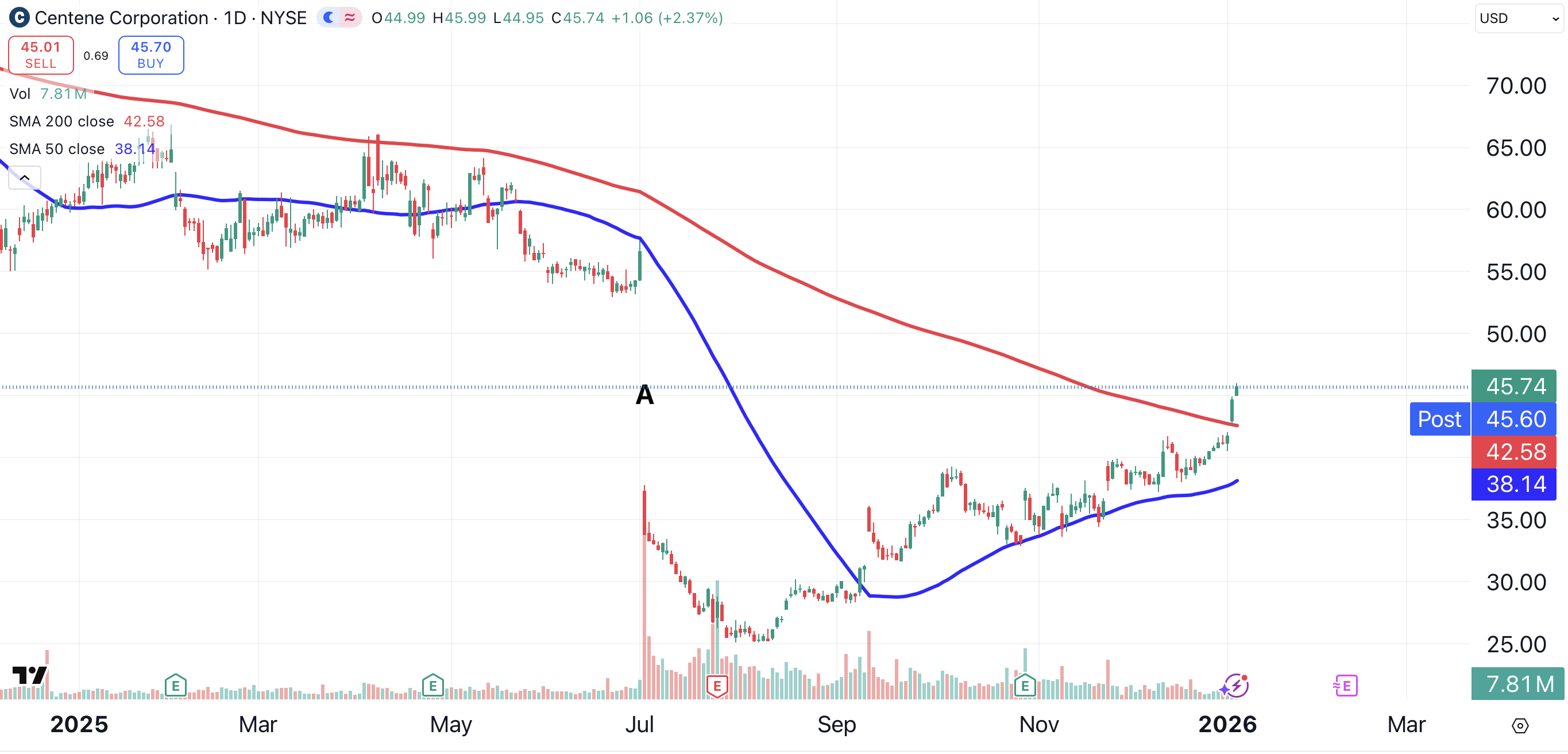 Centene is currently filling a huge gap (point A), giving the stock an express path to $53. Earlier this week, Centene closed above its 200-day moving average (red) for the first time in over a year.