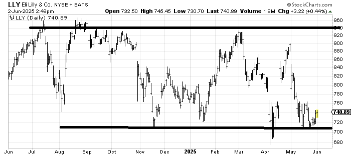 I had not looked at Eli Lilly LLY in a while and I must say I like the chart. It’s so close to support that if it breaks down from here you know you are wrong. But I think this $700 area looks like decent support (considering I like some/many drug stocks now). There is resistance all the way up, so there is no real level that "clears" it up but over $760 would be a start. You’re buying the bottom of a range.