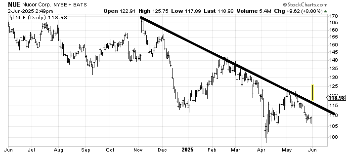 Steel Dynamics STLD has had a lid on it in the $135-ish area for a year now. The only exception was that pop right after the election. So I like that it popped over this area. If it can hang on to this general area that becomes a nice positive for the chart. From my perspective it is the best of these three "metals" charts (CLF, NUE, STLD)