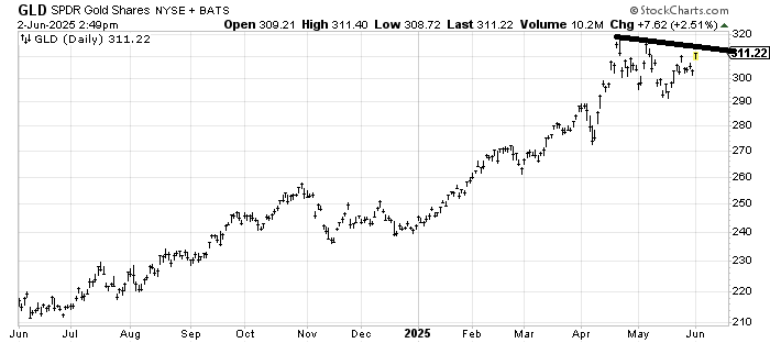 Now that I have re-recommended Newmont NEM I was asked about SPDR Gold ETF GLD. It doesn’t have the same line that NEM had but it’s done some decent work in the last few months so now it needs to stay over $300 and cross that downtrend line ($315-ish).