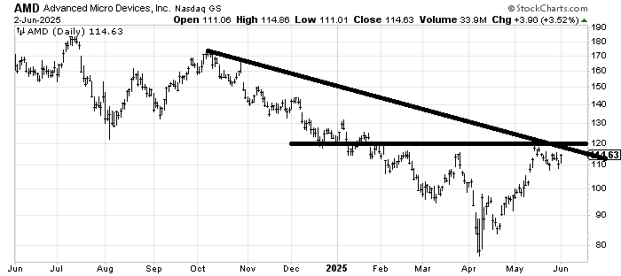 There is someone who asks me about Advanced Micro Devices AMD all the time. It needs to cross over that $120 level. Sure, there is still resistance overhead but clearing a prior high and a downtrend line would be a plus.