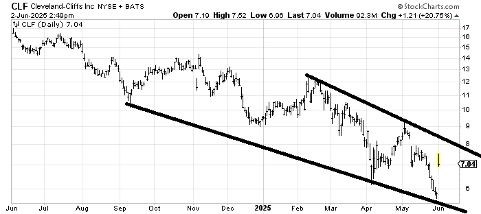 Cleveland-Cliffs CLF is in a downtrend so Monday’s pop just keeps it within the confines of that trend. The best I can say is that it gapped up over $7.