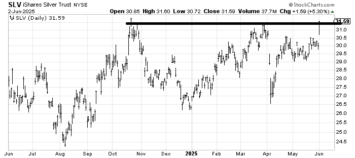 I want to do a couple of follow-ups today. The first is the chart of iShares Silver Trust SLV, an ETF to be long silver, which I recommended a couple of weeks ago. I do not have a measured target for it yet because it needs to clear this $32-ish area first. But the target would be in the upper $30s ($37-39).