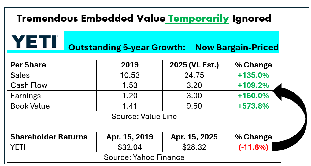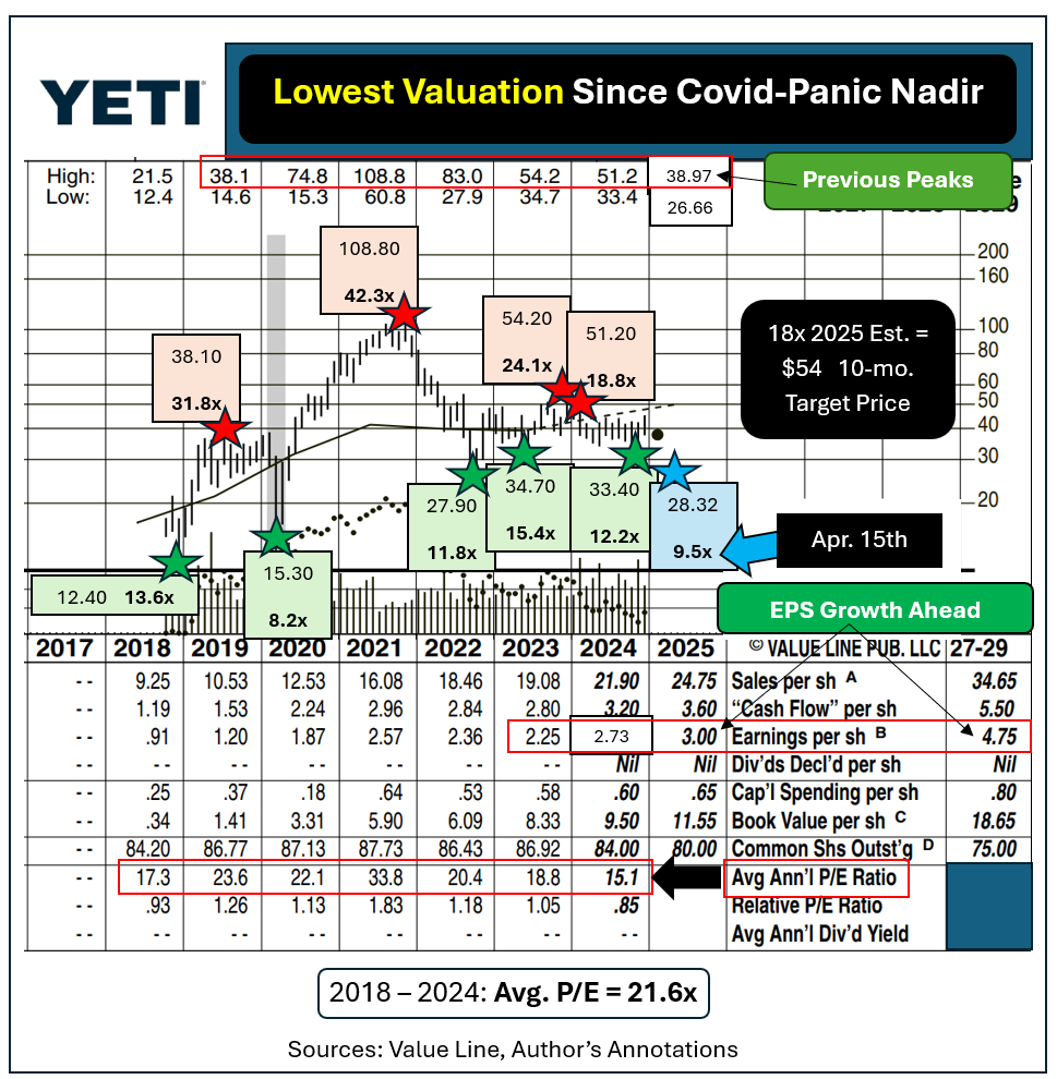 During 2019 YETI fetched 26.7 times earnings. It now trades for about 9.5 times Value Line’s 2025 estimate. Multiple contraction like that has been devastating for long-term owners but presents a fantastic opportunity for those getting involved with YETI now.