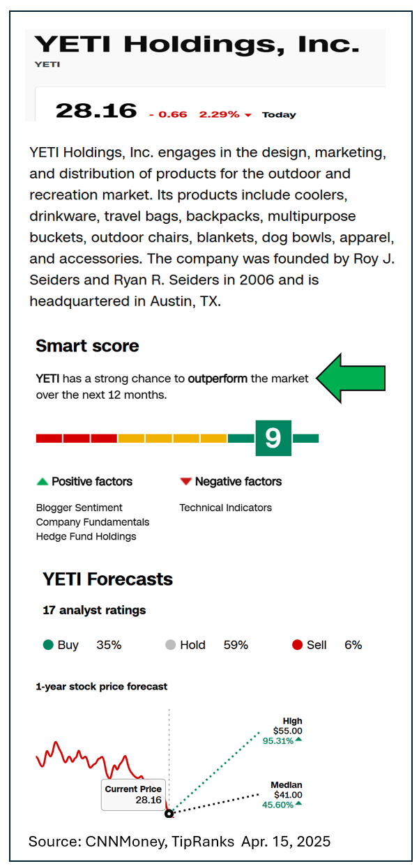 CNN Money, in partnership with TipRanks research, gives YETI a “strong chance to outperform the market” in the year ahead.