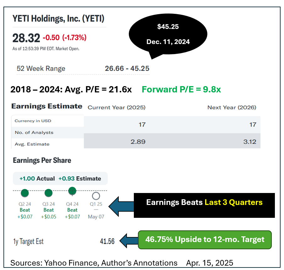 Note, too, that YETI changed hands as high as $45.25 as recently as Dec. 11, 2024.
