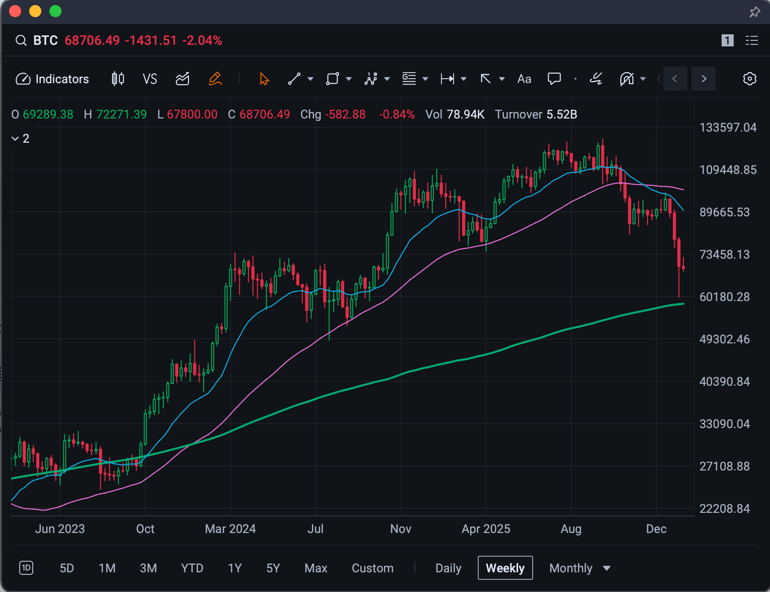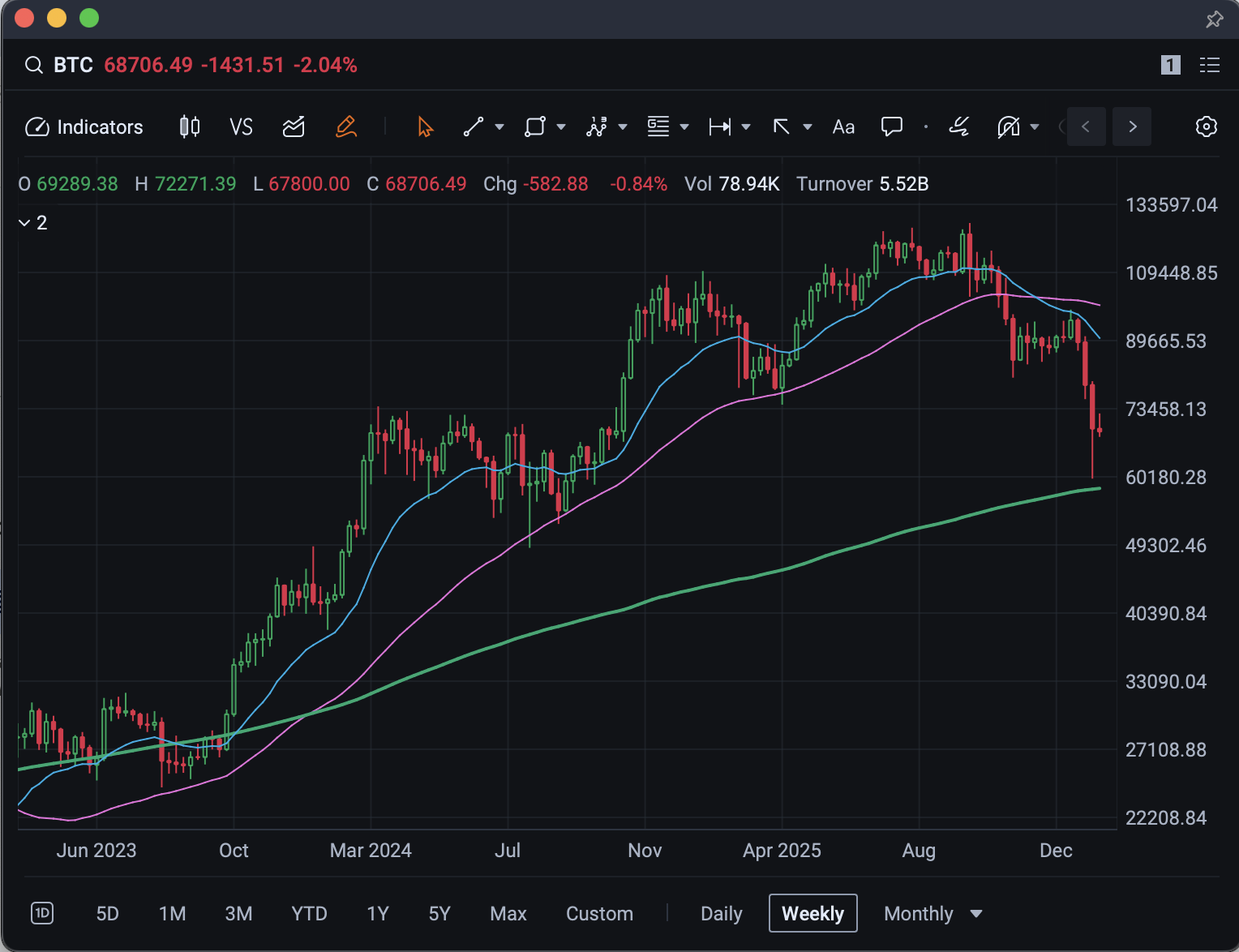 Last week's decline pushed BTC back into the prior congestion zone from late February to early November 2024. Call it roughly $53,000 to $72,000. If you’re looking for a reason to be bullish, you’ve got the 200-week SMA sitting around $58,500. But aside from oversold conditions and sentiment about as rotten as I’ve seen it in a while, this chart has a lot of work to do to look like anything more than a quick scalp.