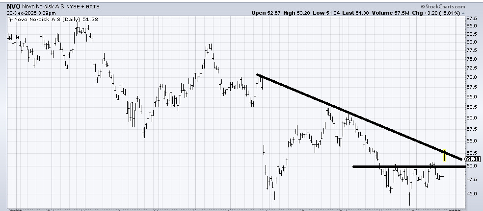 It’s not great that Novo Nordisk (NVO) couldn’t build on the rally today, but I think I am inclined to think pullbacks will get bought for now. This is one of those drug stocks that I think is building a base for a better 2026 (than 2025).