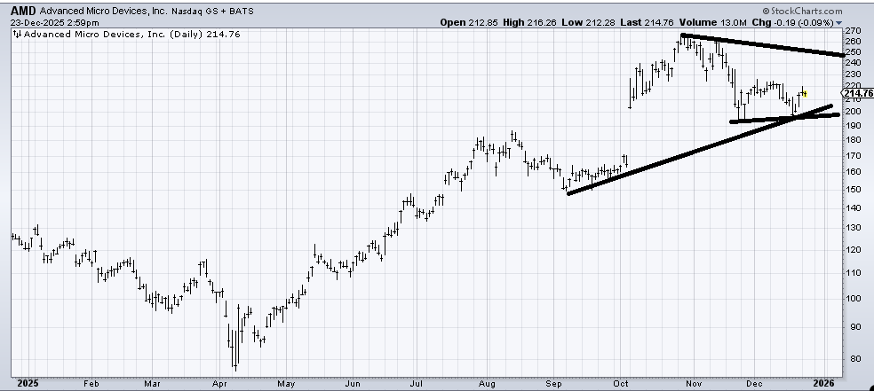The question is, if Advanced Micro Devices (AMD) can join the semiconductor fun. There is decent resistance at that 220-225 area, but the bounce off 200 gives us a good stop level, so I’ll say that before year end AMD ought to enjoy some more rallying.