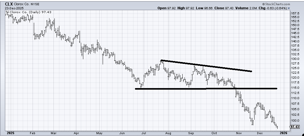 I was asked if there are any staples stocks that I would buy for the turn of the calendar. The caveat is they cannot be food or beverage stocks. I would note that two weeks ago, I recommended Colgate (CL) , and a day or two later, Phillip Morris (MO) . But if you want a chart that the only reason I have to buy it is that it looks severely oversold, then Clorox (CLX) is the name that comes to mind.