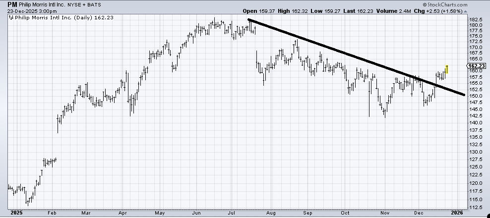 It’s a similar story for Philip Morris (PM) , which I warmed up to two weeks ago. There is a lot of resistance to eat through, so no measurable target yet. I would prefer to see it stay over 155 as of now. If it can get to 165, I would move that number up to 157-158.