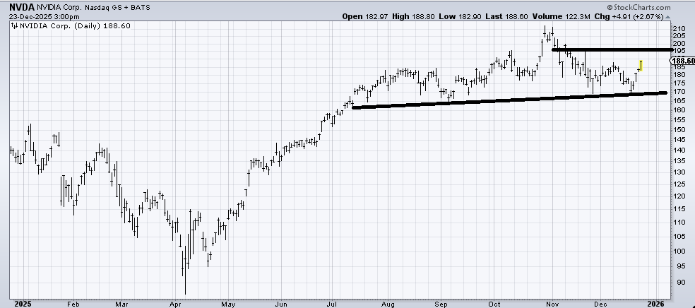 I do not have a measured target for Nvidia (NVDA) . There is a next level of resistance around 195. But thus far, there isn’t enough of a pattern to measure a target. I would now use a stop under 175. A trip back down there would get me a little concerned, especially if it did so before year end.