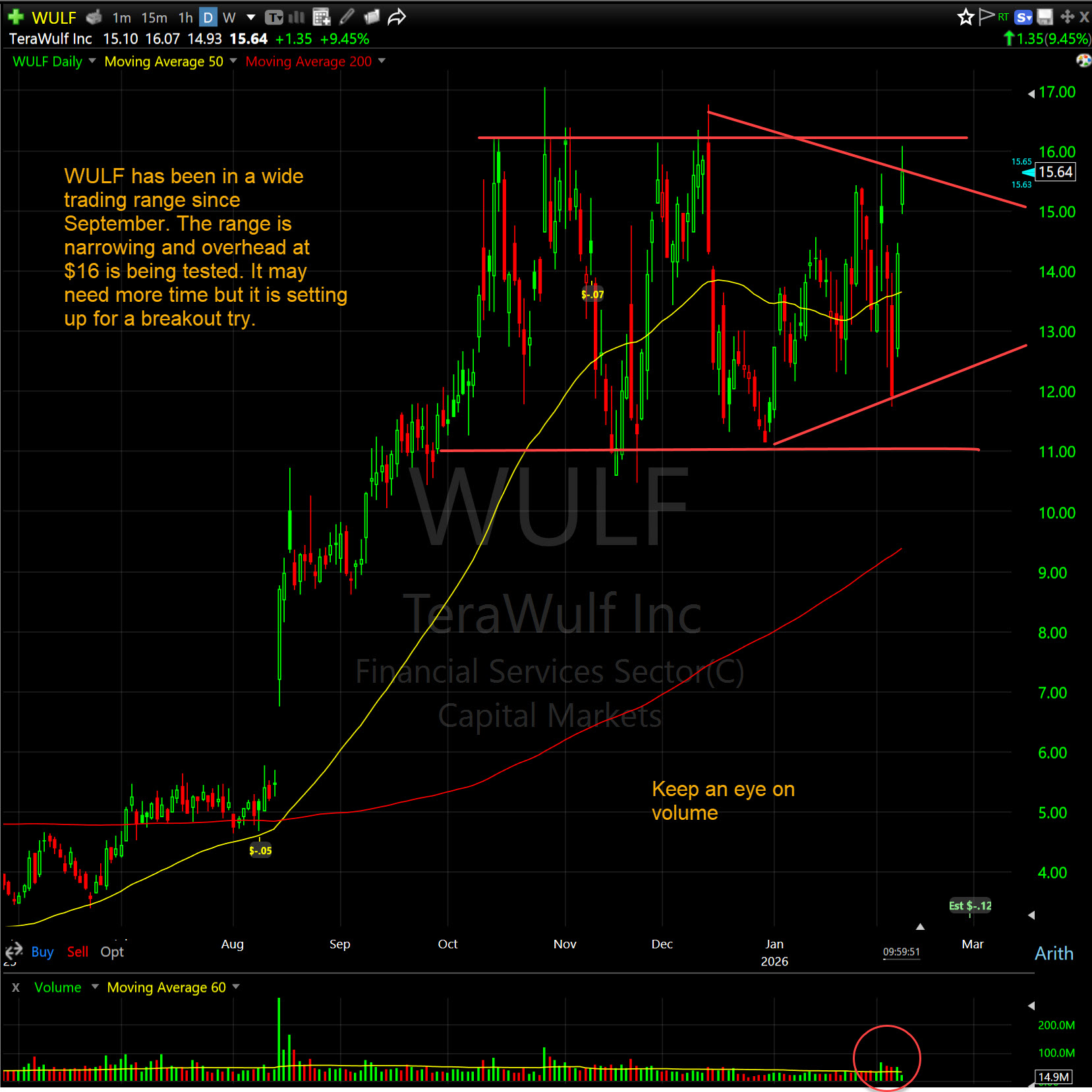 One name that is standing out on my screens today is TeraWulf (WULF) . I have held a position for a while and have actively traded the stock, but I'm adding some size today as it tests overhead resistance.