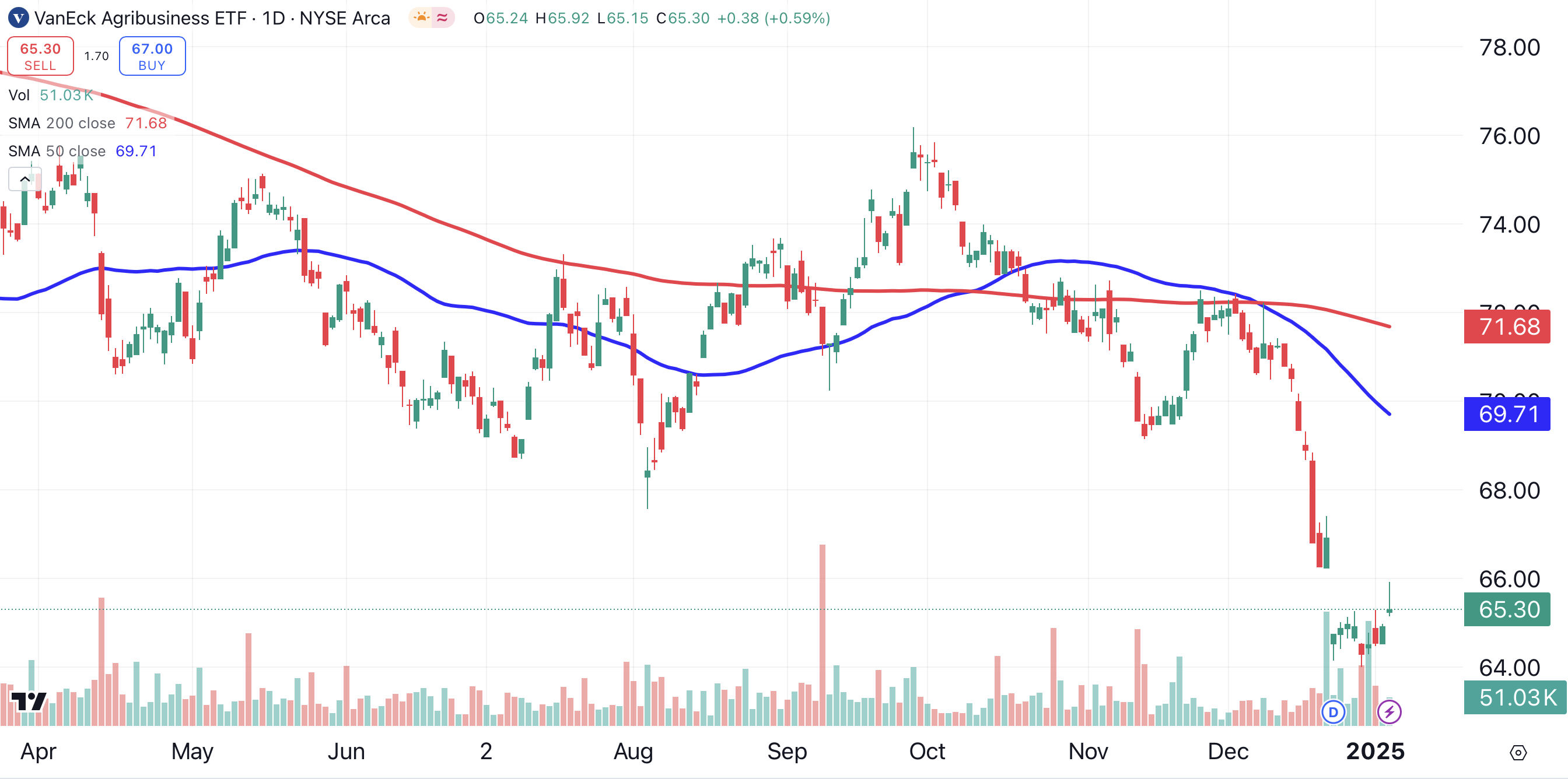 In addition to being a holding of the Materials Select Sector SPDR, Corteva is also a component of the VanEck Agribusiness ETF MOO. Corteva is outperforming MOO, just as it is outperforming XLB. Both ETFs underperformed the major indexes in 2024.