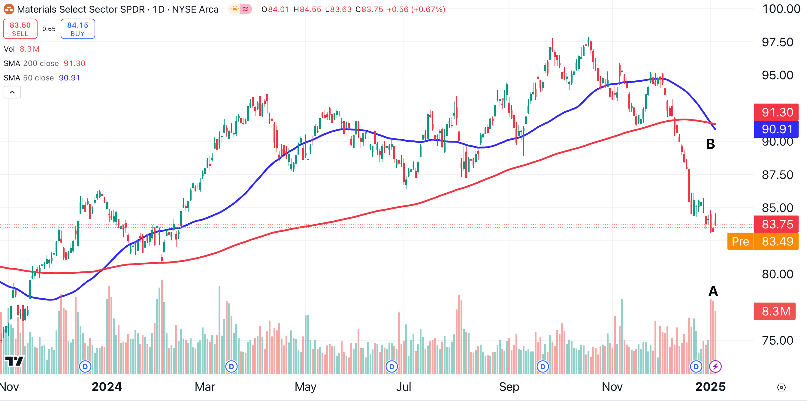 In recent sessions, XLB has traded on heavy volume (point A) as the price has stabilized. The sector bellwether’s falling 50-day moving average (blue) cut beneath its falling 200-day moving average (red), an indication of bearish momentum (point B).