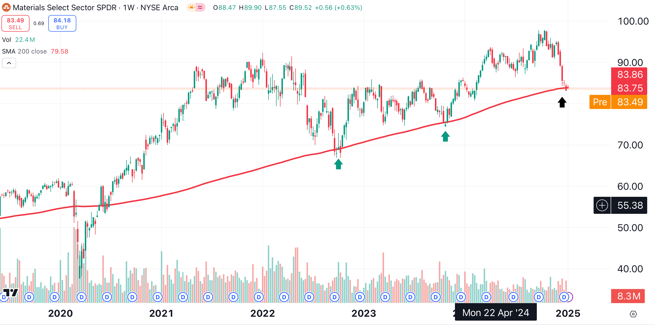 Based on the above, you’d probably want to avoid this sector. However, the longer-term weekly chart tells a different story. In this time frame, the materials sector has reached a major inflection point that could result in a reversal.