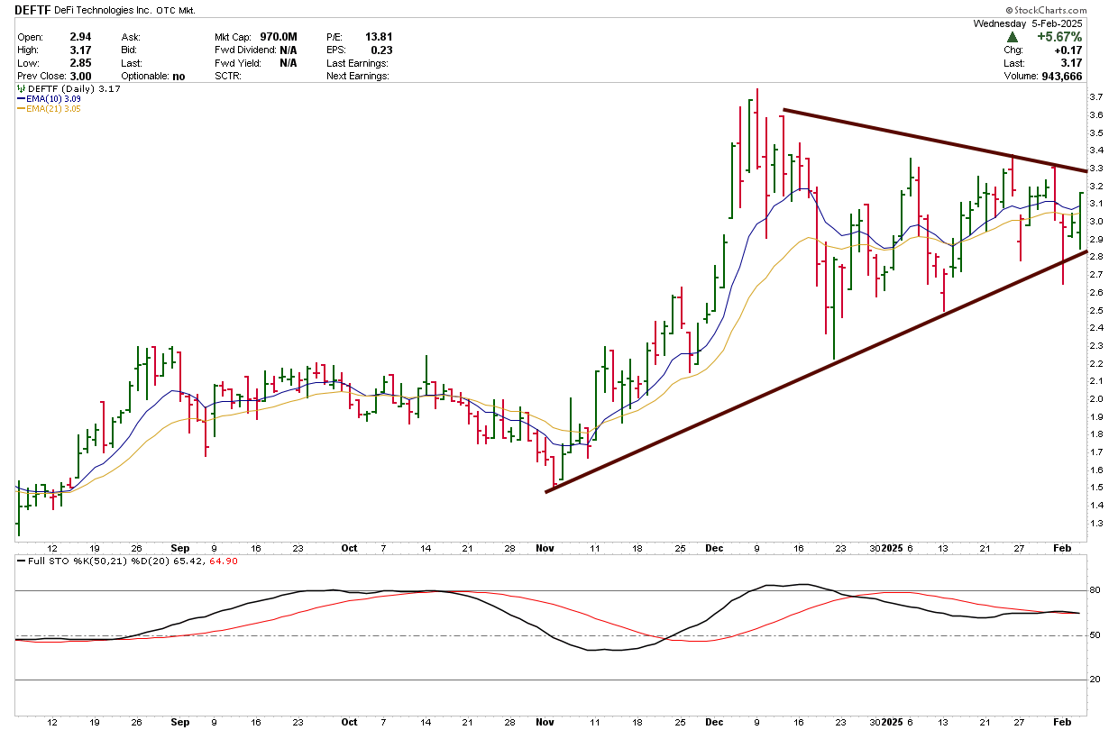 Shares have been consolidating in a wide-wedge pattern with a series of higher lows and lower highs. The uptrend, dating back to November 2024, remains strong support. A close above $3.30 for consecutive days could be the technical catalyst DeFi needs to breakout higher.