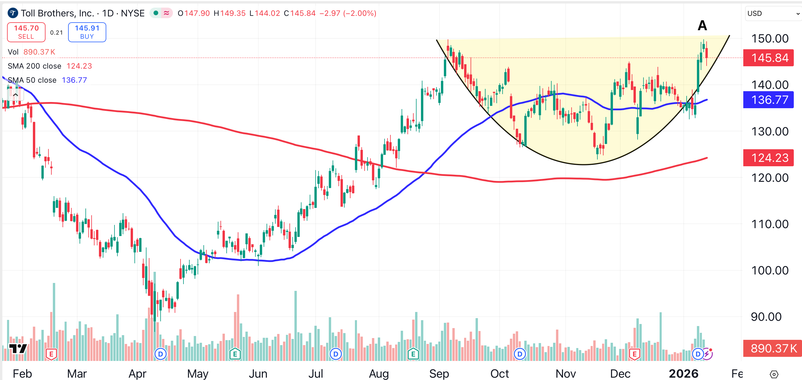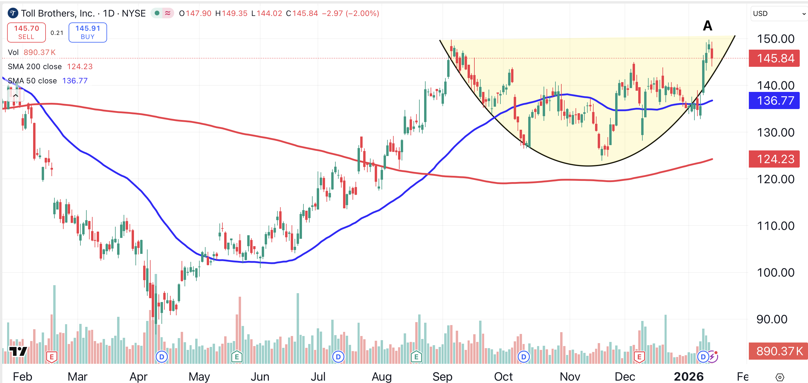 Toll Brothers (TOL) closed at a 52-week high earlier this week (point A). The Fort Washington, Pa.-based builder of luxury homes has formed a saucer pattern over the past four months (shaded yellow).