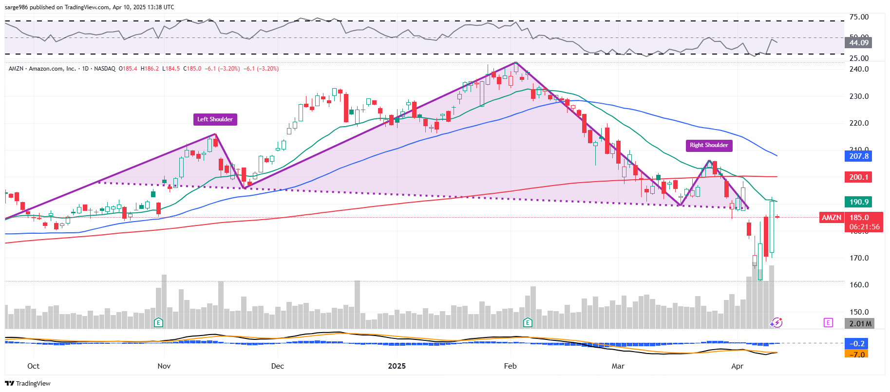 It's a little sloppy, but I would be slow to discount the head-and-shoulders pattern developed by AMZN stock from last autumn into the present. The close above the neckline of the pattern on Wednesday is impressive, but a failure to hold that level today (Thursday) would mean to me that the pattern is still in effect. My target if I had been short the stock instead of just getting out of a long position, would have been $160 based on that pivot.