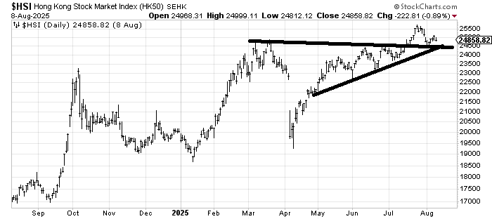 Right now, the Hong Kong Stock market has some support at that 24500 area. I admit I am concerned that it broke out and didn’t go very far. If it breaks 24500 with any oomph, I will think this was a false breakout. Otherwise, I would say give it time, and it should improve.