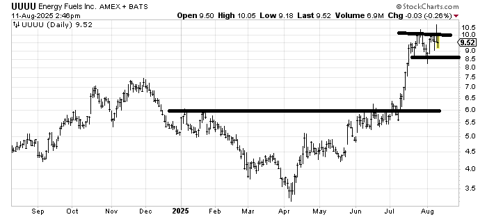 Energy Fuels UUUU hasn’t done anything wrong, but a stock that is up that much is not my cup of tea. Perhaps it is just flagging here, so you don’t want to see it break 8-8.50. Otherwise, wait for a pattern to set up.