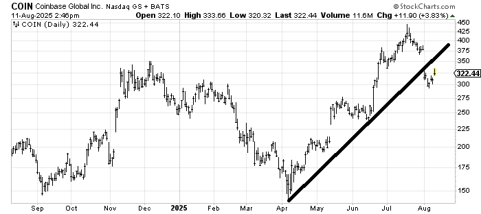When I said I would take some profits in Coinbase COIN, I had no idea it was going to gap down a hundred points. Now I see resistance at 375 (if it can get there). Support is back in the 250-275 area. But mostly I would wait for a pattern to set up again, which is what I said when it was 425. The stock tends to set up well when the time is right. We have had much success trading this when the pattern is good.
