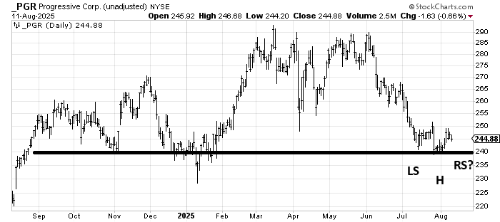 Last week, I reviewed Travelers TRV as a follow-up since someone had asked about it (I said if it could cross that downtrend line, it was much improved). Now I’ve been asked about Progressive (PGR), another insurance company. Step back, and it looks like 240 is a big level; break that, and it’s not good. But what if it is building a small—tiny—head and shoulders bottom? You risk a few bucks (under 240 is not good) to possibly get a bottom?