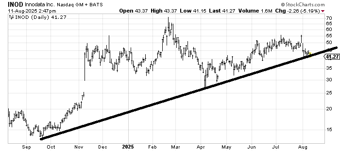 Innodata INOD had better hold here. The next support is back in the 33-35 area, but breaking that long-term trend line would be negative for this stock.